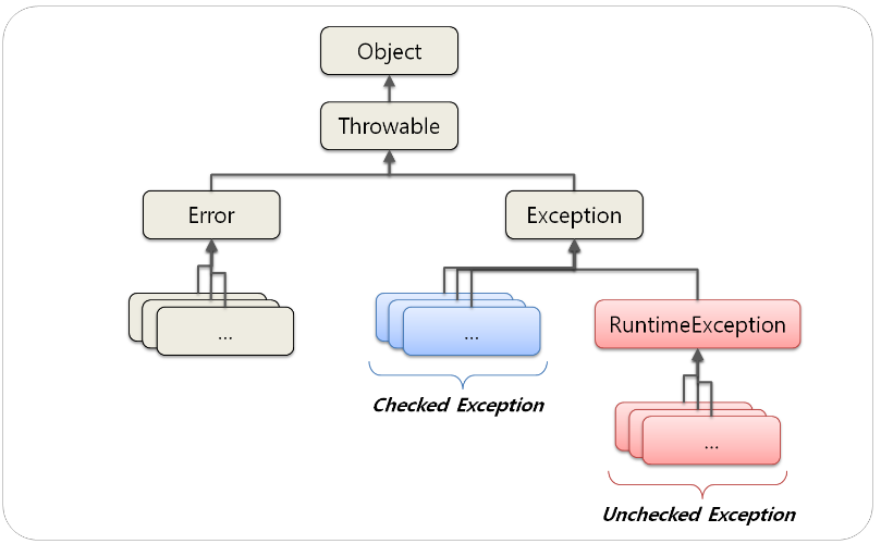 Java의 Checked Exception과 UnCheckedException을 검색하다 보면 이런 표를 쉽게 찾을 수 있습니다.