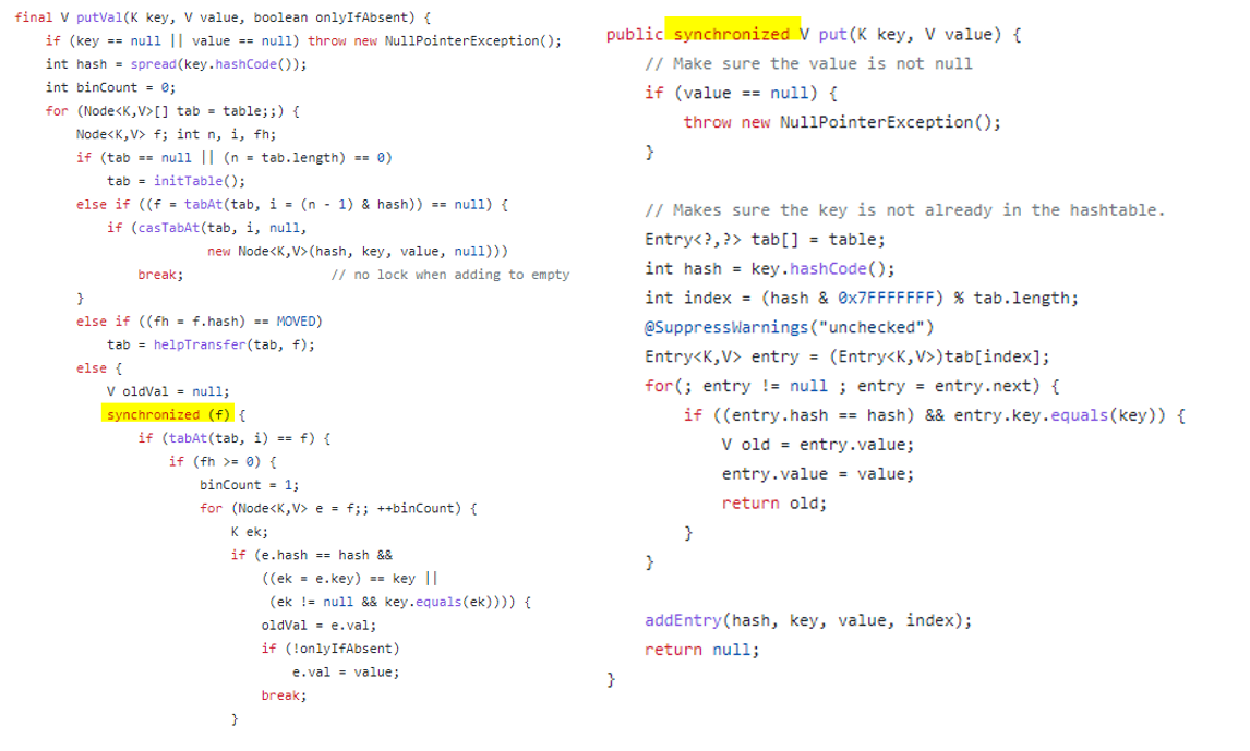 왼쪽은 Java의 ConcurrentHashMap, 오른쪽은 HashTable 클래스의 Put 메소드를 발췌한 것입니다.