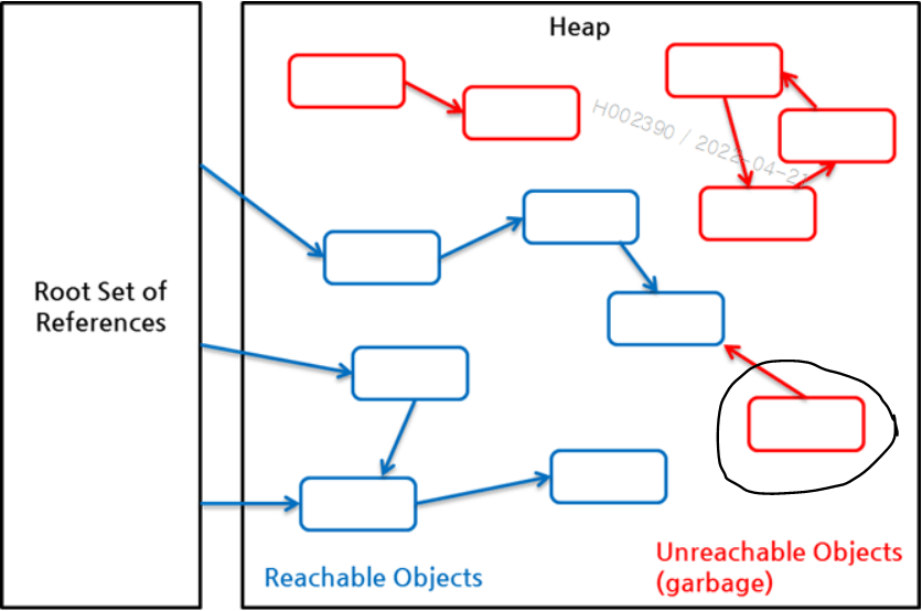 - 단, 여기서 검은색 동그라미를 친 객체는 객체사슬을 이루는 것 같지만 UnReachable이다