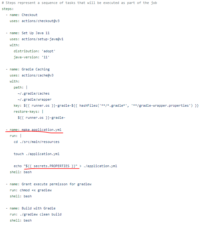 - 배포시에는 해당 repository의 actions secret을 이용해 application.yml파일을 새로 넣어주는 방식으로 진행합니다.