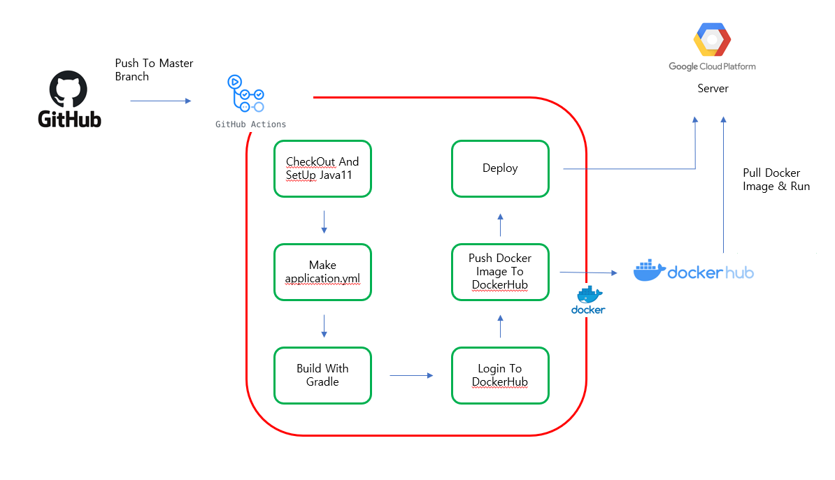 - 배포시에는 푸시해둔 DockerHub의 이미지파일을 pull받고, 서버에서 배포합니다.