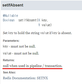 Transaction과 함께 setifAbsent를 사용할 경우 return값이 null입니다. 원하는 결과를 얻을 수 없습니다.