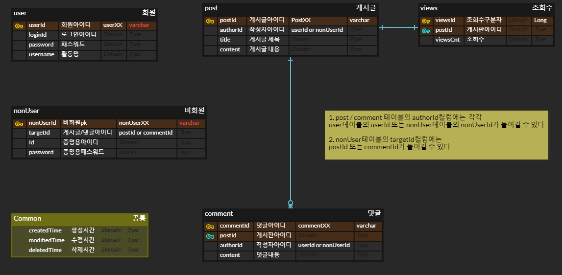 "비회원 마다" 아이디 / 비밀번호가 필요한 것이 아니라 "비회원이 작성하는 게시글 또는 댓글 마다" 아이디 / 비밀번호가 필요하다. 이러면 과연 User 테이블에서 관리해야 할까, post / comment 테이블에서 관리해야 할까?
